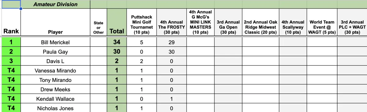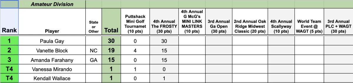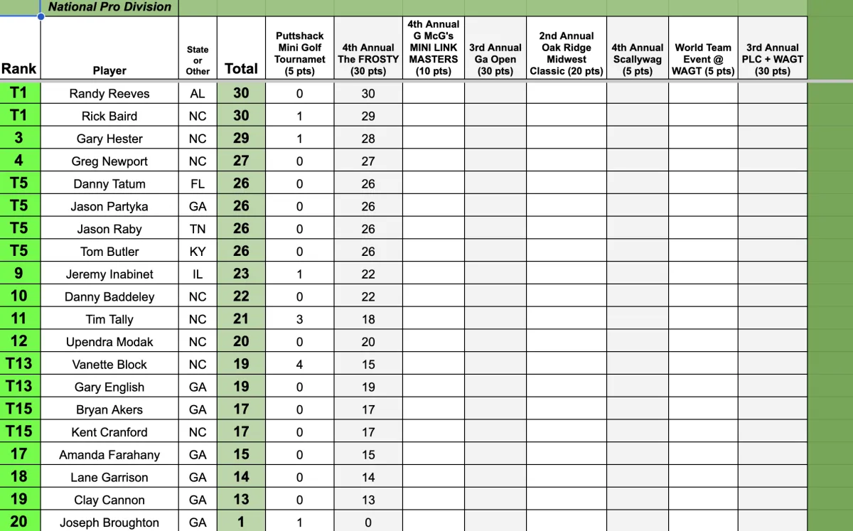 | Rank | Player | Total | The Frosty | Spring Fling | Ga Open | Scallywag #3 | PLC + WAGT |